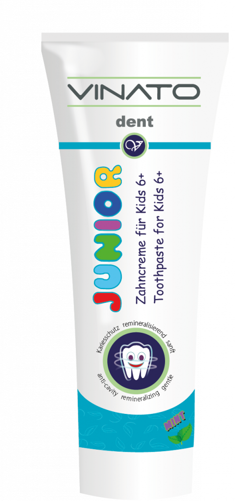 VINATO-dent JUNIOR Toothpaste is specially formulated for optimal cavity protection during the transition of teeth and for permanent teeth. Packed with valuable calcium to support effective tooth remineralization, it provides gentle cleaning through silica for a dazzling smile. The ideal sodium fluoride dosage (1450 ppm), as recommended by DGZMK (German Society for Dental, Oral, and Maxillofacial Medicine), DGK (German Society for Pediatric and Adolescent Medicine), and DGE (German Society for Nutrition), ensures comprehensive cavity prevention. All this comes with a delightful mild mint taste, making each brushing experience fresh and enjoyable for our young ones.
