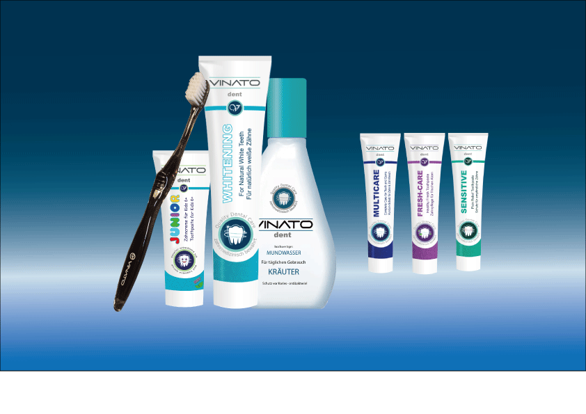 VINATO-dent bietet hochqualitative Zahnpflege. Mit ihren verschiedenen Sorten gehen die VINATO-Zahnpasten gründlich und sorgfältig gegen die am meisten vorkommenden Zahnkrankheiten unserer Zeit vor, nämlich Karies, Zahnstein, Zahnfleischprobleme und Zahnverfärbung. VINATO-dent Zahnpasten sorgen dabei zusätzlich für langhaltende Atemfrische und ein angenehm sauberes Mundgefühl.
